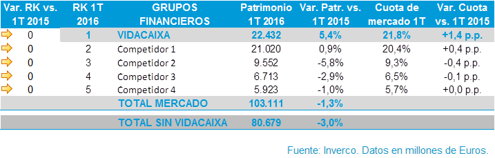 VidaCaixa lidera el rànquing de patrimoni gestionat, amb un avanç d’1,4 punts en la seva quota de mercat respecte al mateix període de l'any anterior (les xifres de VidaCaixa no inclouen el patrimoni dels plans provinents de Barclays). L'increment del 5,4% es deu, principalment, al creixement experimentat en els plans de pensions del sistema individual.