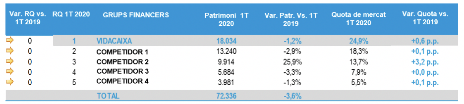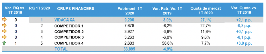 VidaCaixa puja 7,26 punts fins a assolir una quota del 36 %. L’entitat avança un 2,4 % en primes en un mercat que es contreu un 18,2 %.
