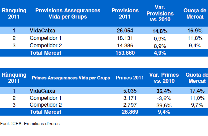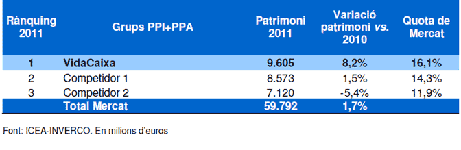 La construcció d'un rànquing conjunt, amb dades d'ICEA i d'INVERCO, dóna com a resultat un mercat de pràcticament 60.000 milions d'euros, i situa VidaCaixa en la primera posició d'aquest rànquing, amb una quota del 16,1% i un creixement en patrimoni del 8,2%.