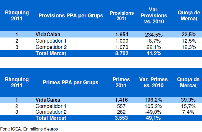 Per volum de primes, el 2011 VidaCaixa pràcticament ha duplicat el volum de negoci, ja que ha arribat als 1.416 milions d'euros, amb una quota de mercat del 39,9%. VidaCaixa personalitza els PPA per a cada client, cosa que ha estat un dels factors clau de l'èxit d'aquest producte. Els plans de previsió assegurats gaudeixen de les mateixes condicions fiscals que els plans de pensions individuals, però amb una rendibilitat garantida. La volatilitat dels mercats converteix els PPA en un instrument idoni d'estalvi destinat a complementar la jubilació.