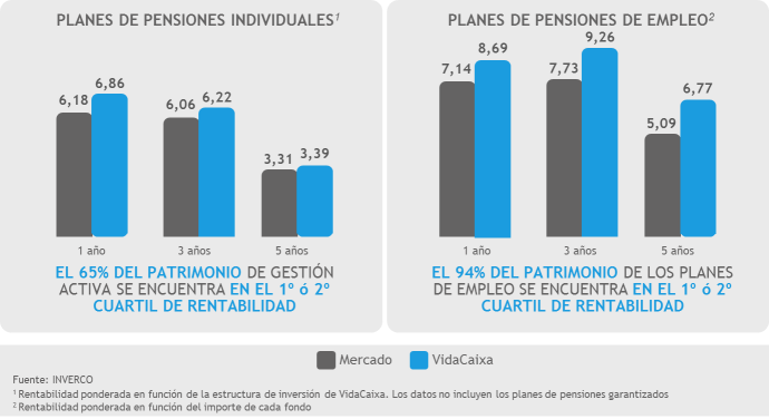 VidaCaixa cuenta con una amplia oferta de planes de pensiones, capaz de satisfacer todos los perfiles de riesgo: desde los más conservadores, centrados en fondos monetarios, hasta los más agresivos, que buscan inversiones a largo plazo en mercados de renta variable emergentes, por ejemplo. La entidad tiene las mejores rentabilidades del mercado no sólo en el último ejercicio sino en los últimos 3 y 5 años, tanto en planes de pensiones individuales como en planes de pensiones de empleo.