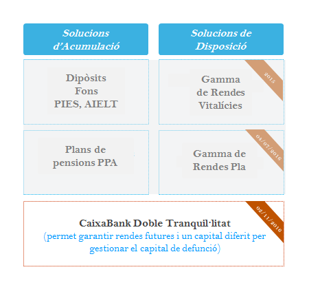 Davant d’un entorn en què s’incrementa l’esperança de vida i l’envelliment de la població, CaixaBank ha evolucionat la seva proposta de solucions de jubilació, fruit d’una anàlisi de les necessitats dels seus clients i de la situació econòmica actual.