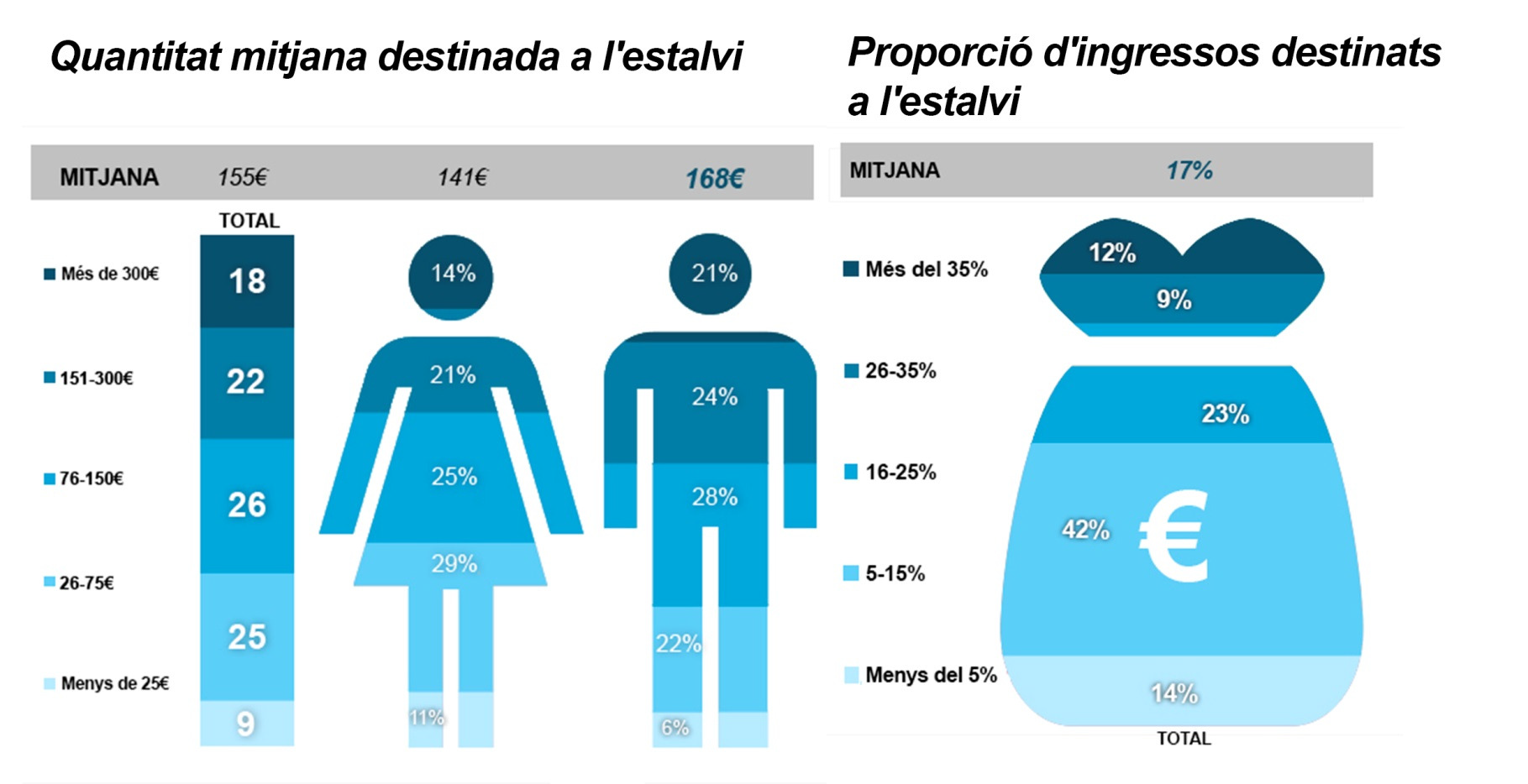 Estalvien de mitjana 155 € al mes. Aquesta quantitat representa un 17% dels seus ingressos. Els homes estalvien un 19% més que les dones.