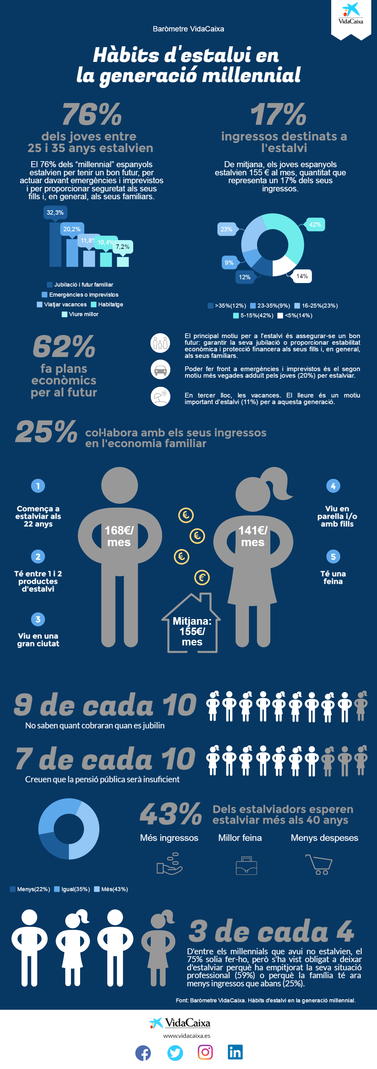 Baròmetre realitzat per TNS Global per a VidaCaixa. Univers: Individus de 25 a 35 anys residents a Espanya. Mostra: 809 entrevistes representatives en funció de sexe, edat, regió i classe social. El marge d'error per a la mostra de 809 és de +/–3,51%, i per a un interval de confiança del 95,5%.