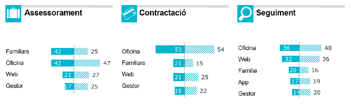 Tot i ser la generació de les noves tecnologies (tenen de mitjana tres dispositius electrònics), els canals que més utilitzen els millennials per assessorar-se sobre productes d'estalvi són familiars i oficines, en tots dos casos en un 42%. Així i tot, afirmen que preferirien fer servir més del que ho fan el web (25%) i un gestor (25%).