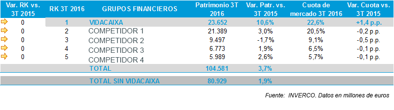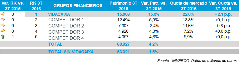 Barcelona, 3 de noviembre de 2016. VidaCaixa, entidad líder del sector asegurador en España, fue la compañía que más creció en planes de pensiones a cierre del tercer trimestre de 2016. Concretamente, el volumen de recursos gestionados en sus planes de pensiones avanzó un 10,6% en relación al mismo periodo del año anterior, una cifra casi 7 puntos superior a la media del mercado, que avanzó a un ritmo del 3,7%. Sin VidaCaixa, este segmento de mercado habría crecido solo un 1,9%. Este crecimiento se traduce en un incremento de la cuota de mercado de 1,4 puntos interanuales hasta alcanzar un 22,6%.En vida también se registra un crecimiento sustancial en recursos gestionados.