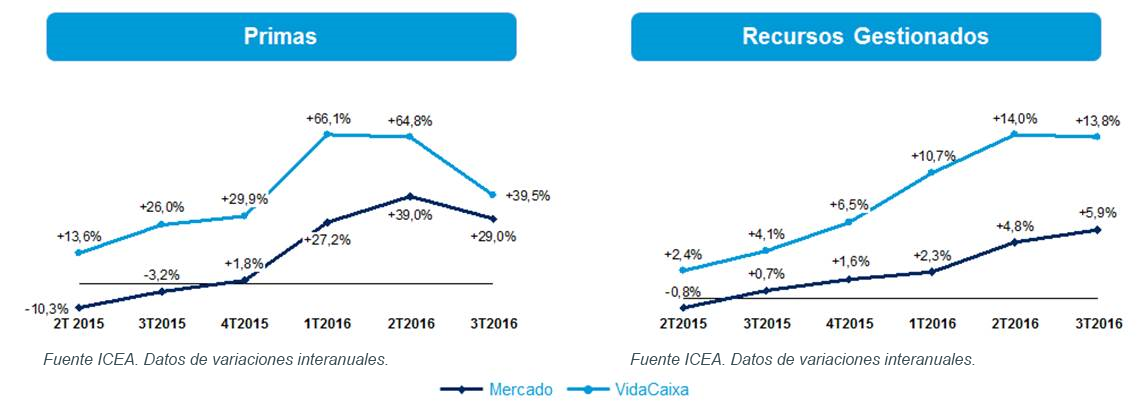 Según los datos de ICEA, las primas de VidaCaixa alcanzaron un volumen superior al de sus tres competidores más cercanos juntos. En la variación interanual, el crecimiento se situó en el 39,5%, muy por encima del crecimiento medio del mercado, que en el tercer trimestre fue del 29%. Sin VidaCaixa, el mercado habría crecido un 3,8% menos.