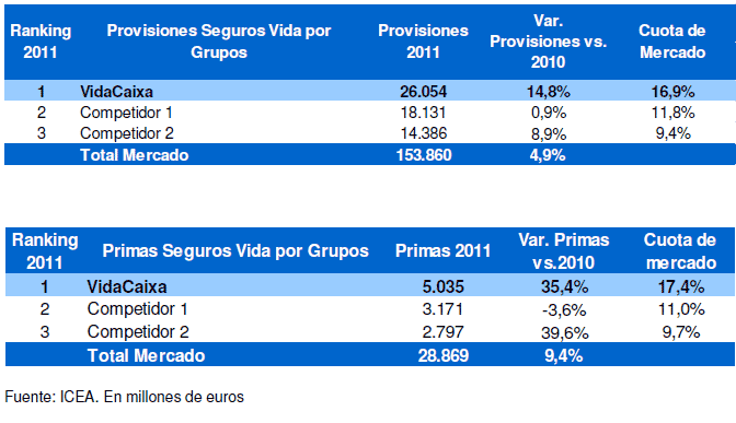 Asimismo, VidaCaixa es líder en volumen de primas comercializadas, con un importe de 5.035 millones de euros en 2011 (+35,4%) y una cuota de mercado del 17,4%, lo que supone haber ganado 3,4 puntos con respecto a 2010.