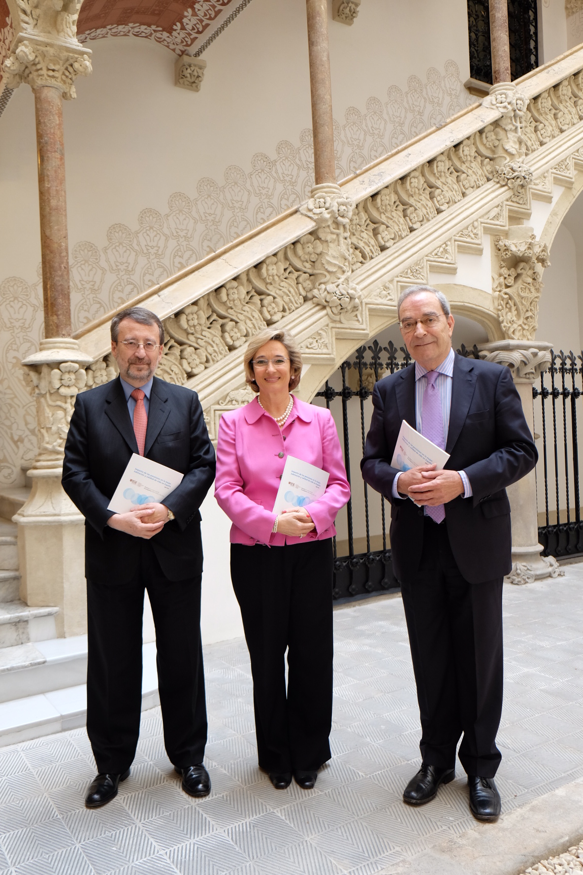 Barcelona, 9 de abril de 2014. Nuria Chinchilla, profesora del IESE Business School (Universidad de Navarra), Tomás Muniesa, Vicepresidente Ejecutivo-Consejero Delegado de VidaCaixa, y Jaime Lanaspa, Director General de la Fundación ”la Caixa”, han presentado hoy en el Palau Macaya de Barcelona el Estudio “Impacto de las pensiones en la mujer. Jubilación y calidad de vida”.