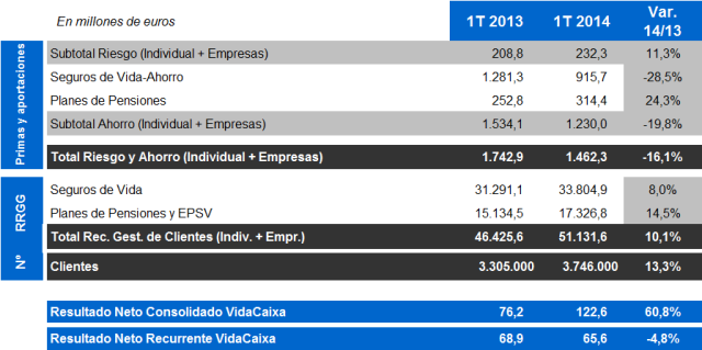 VidaCaixa obtuvo en el primer trimestre de 2014 un beneficio neto recurrente de 65,6 millones de euros. Durante el primer trimestre de este año, VidaCaixa ha realizado una reducción de capital de 1.000 millones de euros, vía prima de emisión. Tras esta operación, el margen de solvencia se situó en 2.892,1 millones de euros, lo que supone una ratio de 1,86 veces por encima del nivel exigido legalmente. En cuanto al resultado de este primer trimestre hay que incluir un beneficio extraordinario de 57 millones de euros netos, como consecuencia de la venta de activos de renta fija (deuda pública y privada).