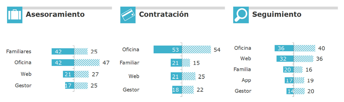 A pesar de ser la generación de las nuevas tecnologías (tienen de media tres dispositivos electrónicos), los canales que más utilizan los millennials para asesorarse sobre productos de ahorro son familiares y oficinas, en ambos casos en un 42%. Aun así, afirman que preferirían utilizar más de lo que lo hacen la web (25%) y un gestor (25%).