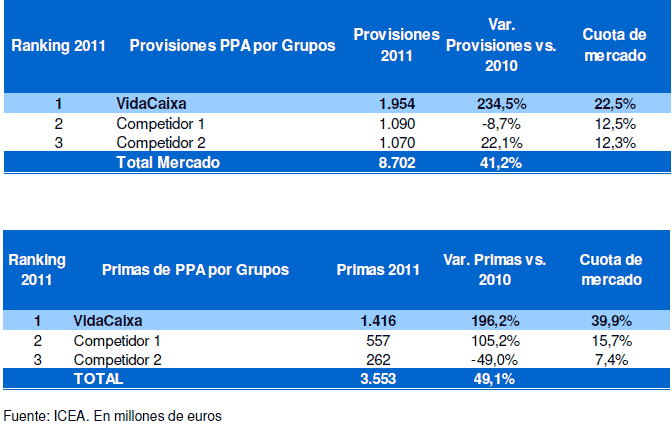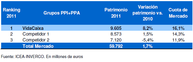 En 2011, VidaCaixa ha gestionado un volumen de ahorro en PPA de 1.954 millones de euros, lo que supone más del doble que en el ejercicio precedente, alcanzando una cuota de mercado del 22,5%.